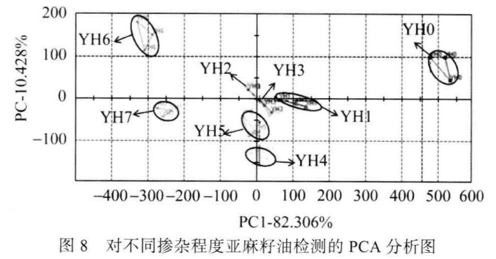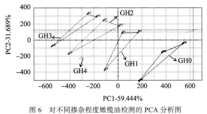采用AlphaM.O.S公司的電子舌,對6種3組同類型、不同品牌、不同產地、不同生產工藝的油脂摻雜樣品進行區分與識別,其檢測限可低至0.1%,識別指數為99分。相比于傳統的食用油摻假檢測,如油脂理化指標檢測、氣相色譜法等,電子舌的檢測方法更靈敏,更準確,并且可以區分成分相近的同種油脂,該檢測方法有助于食用油的地區保護、品牌保護。