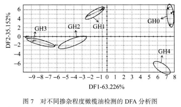 從7根傳感器中優化篩選了CA、JE、HA 3根判別能力較強的傳感器對樣品的味覺信息進行采集和分析。數據處理采用了PCA法和DFA法,其中DFA法要優于PCA法,且2種方法的指紋分辨指數多高于97%,在油脂樣品摻雜量很小的情況下依然可以區分。