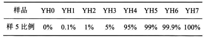 由圖6可知,2個主成分的貢獻率分別為59.444%、31.689%,總貢獻率可達9l_3l%,其中GH0為純的4號樣,GH4為純的3號樣,二者數據點分布區分明顯,并且由樣GHI與二者數據分布較遠可以得出,檢測限可低至0.1%,仍可區分。由圖7可知,DFA方法的2個主成分貢獻率為63.226%、35.152%,總貢獻率可達98.38%,且純的3號樣與純的4號樣區分明顯,各摻雜比例的數據點分布也無重復區域。比較圖6,圖7可以看出DFA方法明顯優于PCA方法。且2種方法都可以明顯地區分這兩者的摻雜。