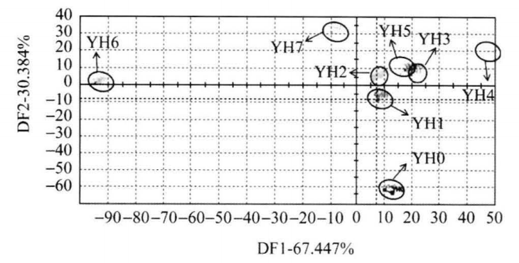 采用PCA法對第3組樣品進行分析,由圖8可得出,優化傳感器后,2個主成分的貢獻率分別為82.306%、10.428%,總貢獻率達到92.734%,不同樣品組的數據點分布在4個象限,YH2與YH3有小部分重疊,其他樣品在主成分分析圖上可以較好區分,說明提取的信息能基本反映數據信息。由圖9可以看出,判別因子1和判別因子2的貢獻率為67.447%、30.364%,總貢獻率為97.811%,其中YH3與YH2有重疊,其他樣品可較好分開,分布在3個不同象限且組內的數據點比較集中。綜合比較圖8、9,可得出2種方法均能對亞麻籽油混樣進行區分,而DFA法要優于PCA法。
