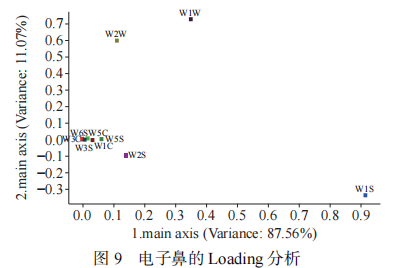 利用Loading分析可以區(qū)分當(dāng)前模式下傳感器的相對(duì)重要性,若傳感器的響應(yīng)值越偏離零,則該傳感器在識(shí)別中作用較強(qiáng),即為識(shí)別傳感器,反之,如果響應(yīng)值接近零,則該傳感器識(shí)別力可以忽略。由圖9電子鼻的Loading分析可以看出,PC1和PC2傳感器的貢獻(xiàn)率分別為87.56%、11.07%,總貢獻(xiàn)率為98.63%,在主成分1(PC1)貢獻(xiàn)率方面,傳感器W1S的貢獻(xiàn)率最大,其次是傳感器W1W;而在主成分2(PC2)貢獻(xiàn)率方面,傳感器W1W的貢獻(xiàn)率最大,其次是傳感器W2W。說明第一主成分主要反映的是對(duì)甲基類,其次是無機(jī)硫化物,第二主成分主要反映的是無機(jī)硫化合物,其次是芳香成分、有機(jī)硫化合物。