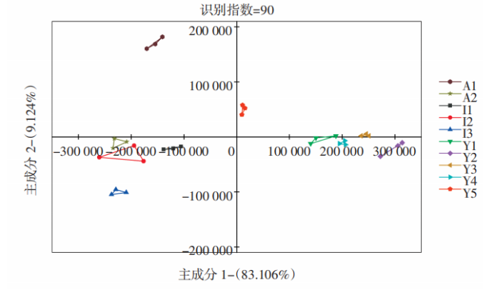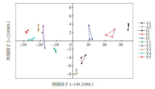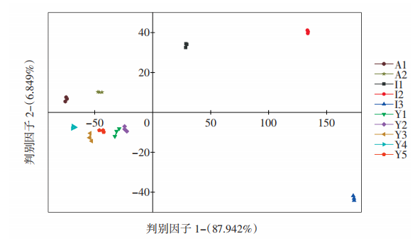 對(duì)10種辣木籽電子鼻數(shù)據(jù)進(jìn)行DFA結(jié)果分析,見圖5。由圖5可知,I1、I2和I3分布在DF1正半軸,A1與A2分布在第二象限內(nèi),Y1、Y2、Y3、Y4和Y5則分布在第三象限內(nèi),說明同一品種辣木籽的氣味相近,不同品種之間氣味上有較大差異。3個(gè)品種辣木籽響應(yīng)值分布在不同區(qū)域內(nèi)且無重疊,因此可用于判別不同品種辣木籽,與色譜圖分析一致。