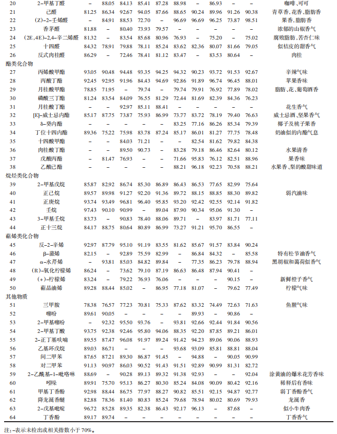 表2 10種辣木籽的氣味成分、相關(guān)指數(shù)及感官描述