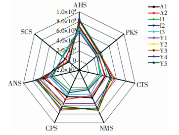 每種辣木籽樣品做3次平行試驗(yàn),計(jì)算味覺傳感器響應(yīng)強(qiáng)度的平均值,得到雷達(dá)圖見圖6。由圖6可知,I1、I2和I3,A1和A2,Y1、Y2、Y3、Y4和Y5辣木籽樣品的各傳感器響應(yīng)強(qiáng)度數(shù)值接近,表明同一品種辣木籽的滋味相似;同時(shí),傳感器AHS、CTS、NMS、CPS、ANS和SCS對(duì)不同品種辣木籽樣品的響應(yīng)值離散程度較大,說明這6種傳感器能較好區(qū)分不同品種辣木籽。
