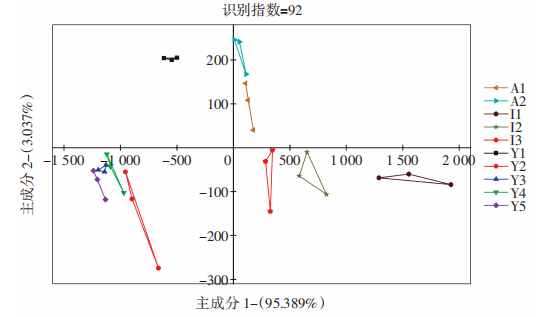 10種辣木籽電子舌PCA結(jié)果見圖7。由圖7可知,識(shí)別指數(shù)為92,說明電子舌對(duì)10種辣木籽滋味有良好區(qū)分度;主成分1貢獻(xiàn)率95.389%,主成分2貢獻(xiàn)率3.037%,累積貢獻(xiàn)率為98.426%,說明2種主成分可以反映出辣木籽整體滋味。中國(guó)云南改良品種的Y1、Y2、Y3、Y4、Y5分布于DF1負(fù)半軸,非洲品種的A1、A2集中在第一象限,印度傳統(tǒng)品種的I1、I2、I3集中于第四象限,說明不同品種辣木籽的滋味有很大差異,而同一品種間滋味相近,與雷達(dá)圖分析結(jié)果一致。