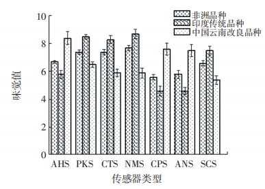 3個(gè)品種辣木籽的味覺分析結(jié)果見圖9。由圖9可知,中國(guó)云南改良品種辣木籽有明顯酸甜滋味,可能與其中酯類成分較多有關(guān);印度傳統(tǒng)品種辣木籽具有苦咸鮮口感,可能是由于辣木籽中含有較多刺激性成分;非洲品種辣木籽各傳感器味覺值適中,滋味更為豐富,電子舌的味覺分析進(jìn)一步印證了電子鼻的風(fēng)味成分檢測(cè)結(jié)果。