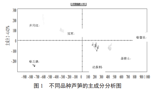 圖 1 為 6 個不同品種蘆筍樣品的主成分 PCA 分析圖,第 1 主成分和第 2 主成分的總貢獻率達到了98.1%,足以收集特征信息。在圖 1 中,不同品種蘆筍分別聚類在 PCA 圖中的不同區域,相互之間能夠較好地區分。