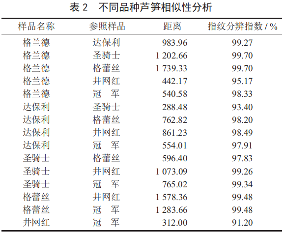 表2是6個不同品種蘆筍電子舌相似性分析結果,達保利品種和圣騎士品種兩者之間的距離值最小,可知兩者的相似性較大。格蘭德和格蕾絲的距離值最大,可知兩者的相似性最小。