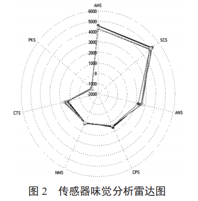 傳感器味覺分析雷達圖見圖2,不同品種蘆筍的味覺分析見表3。