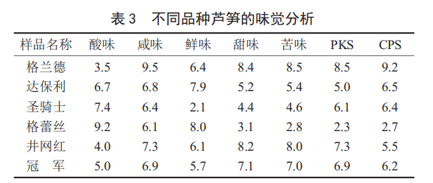 研究表明,6個不同品種的蘆筍水分含量差異較小,可溶性糖含量有所差異,格蘭德品種的可溶性糖含量較高,格蕾絲含量較小,這與電子舌味覺分析一致。格蘭德品種的咸味、甜味和苦味較大,酸味較小;格蕾絲的酸味和鮮味較大,甜味和苦味較小。達保利品種和圣騎士品種的相似性較大,格蘭德和格蕾絲的相似性最小。采用電子舌技術可以很好地區分不同品種蘆筍的味覺差異,還可以利用主成分分析明確地辨別不同品種之間的相似性大小。