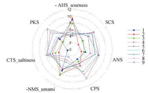 懷區9種不同主栽品種懷地黃RSD分別為0.42%、1.35%、0.56%、0.34%、0.42%、0.22%、0.22%,樣品3次重復間相對標準偏差都比較小,說明樣品在重復測試過程中電子舌儀器的穩定性、重現性好。由圖5可知,PC1與PC2的貢獻率之和達到了95.060%,其識別指數為93,說明這9種生地黃樣品滋味能夠快速地通過電子舌很好區分開來。在主成分分析圖中,樣品間的相對距離越近,則樣品整體滋味越接近,其中“金九”與“85?5”樣品的相對距離最近,滋味差別最小;“噸王”與“沁懷”的相對距離最遠,滋味差別最大。