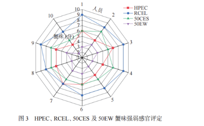 香氣感官評定 隨機選擇10名經過感官評定培訓的人員,對制備的HPEC、RCEL、50CES和50EW蟹味強弱進行評定,蟹味濃,取7~10分;蟹味稍濃,取4~7分;蟹味較淡,取0~4分。