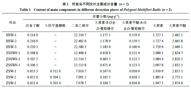 2.2.9  樣品測定  分別稱取生何首烏、九蒸九曬何首烏、藥典法制何首烏飲片適量,按“2.2.3”項下方法制備供試品溶液,每個樣品平行2次,按“2.2.1”項下色譜條件進行測定,記錄峰面積并計算各成分含量,結果見表1。含量測定結果表明,何首烏不同飲片中均含有沒食子酸、二苯乙烯苷、大黃素-8-O-β-D-葡萄糖苷、大黃素甲醚-8-O-β-D-葡萄糖苷、大黃素、大黃素甲醚6種成分,但不同飲片間各成分含量存在一定差異。九蒸九曬、藥典法制何首烏中沒食子酸及蒽醌苷元類成分的含量與生何首烏相比,均有不同程度的增加,其中以沒食子酸含量增加最為顯著,藥典法制何首烏約為生品的3倍,九蒸九曬何首烏約為生品的2倍。炮制為制何首烏后,苷類(二苯乙烯苷、蒽醌苷)成分含量顯著減少,與生何首烏相比,九蒸九曬何首烏中二苯乙烯苷含量減少了約44%,蒽醌苷類成分含量減少了約41%;藥典法制何首烏中二苯乙烯苷含量減少了約69%,蒽醌苷類成分含量減少了約85%;而5-羥甲基糠醛僅在藥典法制何首烏飲片中檢出,平均質量分數為0.506 1 mg/g。