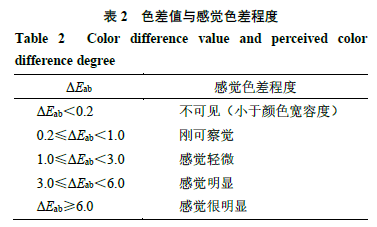 電子眼采用的色彩系統中L*代表明度指數,a*(紅-綠軸)、b*(黃-藍軸)代表顏色對立維度。對于樣品1、2,ΔL*L1*L2*,為正值時樣品1顏色偏淺,為負值時樣品1顏色偏深。Δa*a1*a2*,為正值時樣品1顏色偏紅,為負值時樣品1顏色偏綠。Δb*b1*b2*,為正值時樣品1顏色偏黃,為負值時樣品1顏色偏藍。樣品顏色可用色度值(Eab*)表示,計算公式為Eab*=(L*2a*2b*2)1/2。2個樣品之間的色差為ΔEab,計算公式為ΔEab=(ΔL*2+Δa*2+Δb*2)1/2,色差值與人眼感覺色差程度的關系見表2。