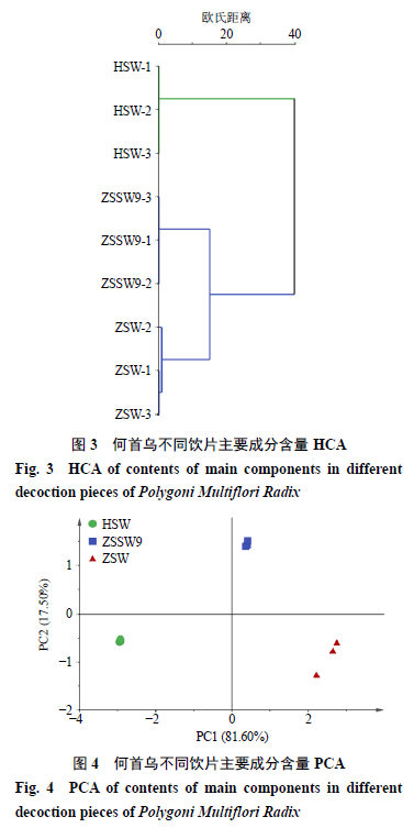 2.4.1 含量測定數據分析  將何首烏不同飲片主要成分含量數據導入SIMCA 14.1進行系統聚類分析(hierarchical cluster analysis,HCA)與無監督的主成分分析(principal component analysis,PCA),觀察何首烏不同飲片間聚類與自然聚集,結果見圖3、4。HCA結果顯示,何首烏不同飲片可各自聚類,當分類距離大于15時,3種飲片聚為2類,生何首烏聚為一類,九蒸九曬何首烏與藥典法制何首烏聚為一類。PCA結果顯示,PC1和PC2的貢獻率分別為81.60%和17.50%,累積貢獻率達99.10%,說明該數據能較好反應何首烏不同飲片的整體信息。何首烏不同飲片各自聚集,可分為3類,生何首烏集中分布在III象限,九蒸九曬何首烏集中分布在I象限,藥典法制何首烏集中分布在IV象限。