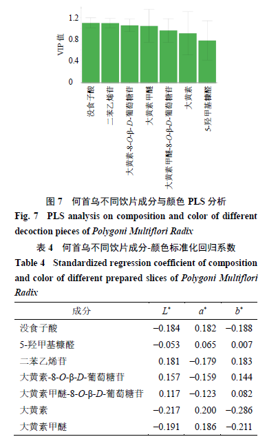 根據PLS模型的回歸系數(表4),沒食子酸、大黃素、大黃素甲醚的含量與L*b*值呈負相關,與a*值呈正相關;5-羥甲基糠醛的含量與L*值呈負相關,與a*b*值呈正相關;二苯乙烯苷、大黃素-8-O-β-D-葡萄糖苷、大黃素甲醚-8-O-β-D-葡萄糖苷的含量與L*b*值呈正相關,與a*值呈負相關。提示沒食子酸、大黃素、大黃素甲醚這3種成分與何首烏飲片變深、變紅、變藍有關,與炮制后何首烏飲片顏色總體變化相一致;二苯乙烯苷、大黃素-8-O-β-D-葡萄糖苷、大黃素甲醚-8-O-β-D-葡萄糖苷這3種成分與何首烏飲片變淺、變綠、變黃有關,與炮制后何首烏飲片顏色總體變化相反。