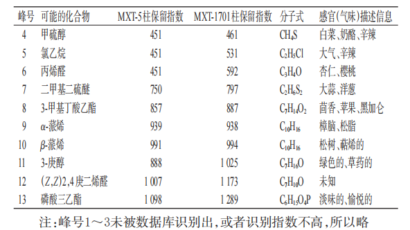 通過對兒童型香囊(編號A1~A15)樣品粉末進行分析,得到不同放置時間樣品的色譜圖,見圖1。由圖1可知,隨著放置時間的延長,色譜峰的峰高逐漸降低、數量逐漸變少,說明不同放置時間兒童型香囊的氣味存在明顯差異。通過Kovats保留指數定性分析,并與電子鼻自帶的Arochembase數據庫信息匹配后共鑒定出10種氣味成分,結果見表2。其中,α-蒎烯(9號峰)作為天然香料,有著和松木樹脂類似的香氣,具有抗菌、殺菌作用,可以減輕炎癥反應、抑制腫瘤細胞生長、抗病毒等;β-蒎烯(10號峰)同樣具有抑菌、抗腫瘤作用。因此,可將α-蒎烯和β-蒎烯作為兒童型香囊的功能性指標成分。