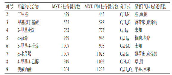 表3 成人型香囊氣味物質基礎及感官描述信息