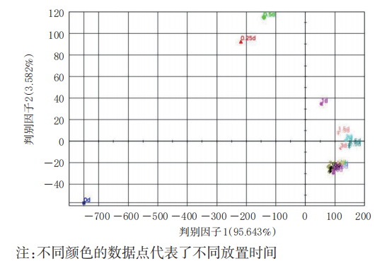 判別因子分析是一種用于構建模型和判定個體所屬類別的統計方法。與主成分分析相比,其可使不同類組群數據間差異盡可能擴大,而使同類組群數據間差異盡可能縮小,從而建立更好識別的數據模型,更好地體現出樣品的差異性。本研究采用Heracles NEO型超快速氣相電子鼻自帶的軟件對不同放置時間中藥香囊的色譜圖數據進行判別因子分析。