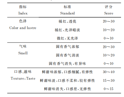 挑選10位專業人士,組成感官評定小組。根據評分標準(表1)進行感官評分,以脊尾白蝦色澤、氣味、滋味、口感作為評價指標,取10位評論員打分的平均值進行記錄。100分品質最好,80分品質良好,60分品質可接受,0分品質最差。