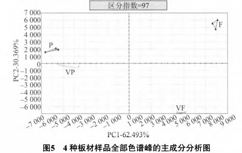 為減少試驗過程中的誤差,選取試驗中的3組數(shù)據(jù)進行分析。根據(jù)試驗方法,選擇試驗結(jié)果中的全部色譜峰進行PCA分析,得到圖5。當(dāng)區(qū)分指數(shù)(Discrimination index)>80時就可以認(rèn)為二者區(qū)分度較好,且數(shù)值越接近100區(qū)分度越高。由圖5可知,主成分1(PC 1)即橫坐標(biāo)對4種板材的區(qū)分度為62.493%,主成分2(PC 2)縱坐標(biāo)的區(qū)分度為30.369%。電子鼻將所有的區(qū)別因素化繁為簡,綜合提取了兩種區(qū)分因素即PPC l和PC 2便可將4種板材樣品區(qū)別開來。4種板材的區(qū)分指數(shù)為97,這說明Heracles II能夠很好地區(qū)分不同的人造板材樣品。