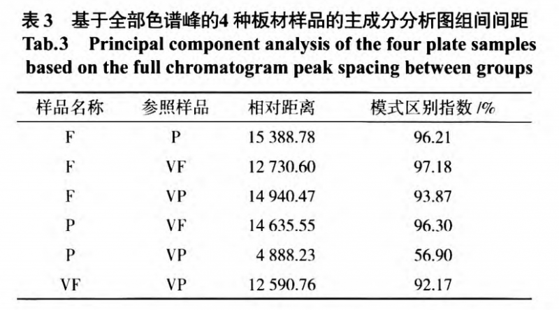 通過4種樣品的相對位置大致了解樣品的區(qū)別,橫縱坐標(biāo)的數(shù)值只是相對位置。在4種板材樣品中,刨花板與貼面刨花板距離較近且明顯遠離其他兩種樣品,說明刨花板與貼面刨花板之問樣品差異較小,氣味較為接近,即刨花板貼面與否與氣味差別的大小關(guān)系相對較低。而對于纖維板和貼面纖維板樣品來說,二者相對距離較遠,不僅在種類上明顯區(qū)別于刨花板和貼面刨花板,而且可以看出是否貼面對于纖維板板材成品氣味的影響較大。