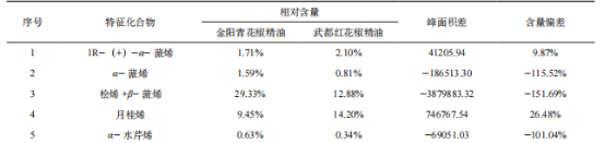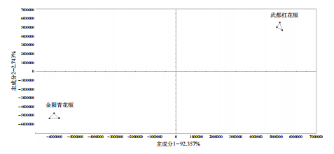 青花椒油中共分析出11種含量較高成分,紅花椒油中共分析出13種含量較高成分,乙酸芳樟酯與乙酸香葉酯在青花椒油中未曾檢測(cè)出。 通過(guò)計(jì)算峰面積差值和含量偏差可知,乙酸芳樟酯等酯類(lèi)物質(zhì)僅存在于紅花椒油中,與精油情況一致,青紅花椒油中芳樟醇含量差別最大,差異最為明顯,乙酸芳樟酯僅存在于紅花椒原料中,由此可利用花椒精油產(chǎn)品中檜烯、β-蒎烯、芳樟醇含量和乙酸芳樟酯、乙酸香葉酯等酯類(lèi)物質(zhì)存在與否來(lái)區(qū)分花椒精油種類(lèi)。對(duì)青紅花椒原料及花椒提取物進(jìn)行指紋圖譜與物質(zhì)定性分析,青紅花椒在成分種類(lèi)上有差異,紅花椒成分較青花椒復(fù)雜,主要體現(xiàn)在乙酸芳樟酯、乙酸香葉酯等酯類(lèi)和醛類(lèi)物質(zhì)上;青紅花椒各成分相對(duì)含量上差異明顯,其中芳樟醇、檜烯差異最為明顯,D-檸檬烯含量差別大,但差異貢獻(xiàn)度不大;芳樟醇、乙酸芳樟酯等成分可用來(lái)鑒別青紅花椒產(chǎn)品類(lèi)別,且電子鼻分析速度快,可大大節(jié)約成本。 圖3 武都紅花椒油、金陽(yáng)青花椒油指紋圖譜 表3 武都紅花椒油、金陽(yáng)青花椒油特征化合物相對(duì)含量與峰面積差異 主成分分析(PCA)是一種常見(jiàn)的多元統(tǒng)計(jì)方法,主要通過(guò)將采集的多指標(biāo)進(jìn)行數(shù)據(jù)轉(zhuǎn)換與降維,使用線(xiàn)性分類(lèi)處理降維的特征向量,盡可能捕集數(shù)據(jù)集間最大差異,從整體層面上直觀(guān)地展示樣品分布。對(duì)花椒原料、花椒精油、花椒油進(jìn)行主成分分析,由圖4原料主成分分析可以看出,兩種花椒原料之間存在顯著差異,現(xiàn)有數(shù)據(jù)可對(duì)未知產(chǎn)地的原料進(jìn)行產(chǎn)地區(qū)分,前提是原料來(lái)自?xún)蓚€(gè)產(chǎn)地。后續(xù)可收集其余產(chǎn)地花椒原料,積累大量數(shù)據(jù),建立原料質(zhì)量標(biāo)準(zhǔn),對(duì)實(shí)際應(yīng)用中采購(gòu)、生產(chǎn)、銷(xiāo)售提供指導(dǎo)性建議。 圖4 武都紅花椒、金陽(yáng)青花椒原料主成分分析 對(duì)6類(lèi)花椒精油樣品進(jìn)行PCA分析,結(jié)果如圖5所示,PC1與PC2相加大于91.38%,代表被檢測(cè)樣品中絕大部分信息,說(shuō)明實(shí)驗(yàn)的花椒精油樣品成分存在差異,呈現(xiàn)不同類(lèi)型風(fēng)味,主成分分析能對(duì)不同種類(lèi)花椒精油進(jìn)行識(shí)別與區(qū)分。 對(duì)四類(lèi)花椒油樣品進(jìn)行PCA分析,結(jié)果如圖6所示,PC1方差貢獻(xiàn)率為89.896%,PC2的方差貢獻(xiàn)率為0.953%,兩者累計(jì)方差為90.849%,主成分顯示樣品中絕大部分信息,說(shuō)明實(shí)驗(yàn)的花椒油樣品成分存在差異,呈現(xiàn)不同類(lèi)型風(fēng)味,主成分分析能對(duì)不同種類(lèi)花椒油進(jìn)行識(shí)別與區(qū)分。 利用超快速氣相電子鼻技術(shù),解析不同產(chǎn)地花椒及花椒提取物指紋圖譜,明確花椒及花椒提取物揮發(fā)性風(fēng)味物質(zhì),芳樟醇、乙酸芳樟酯等成分可用來(lái)鑒別青紅花椒產(chǎn)品類(lèi)別,且電子鼻分析速度快,可大大節(jié)約成本,利用超快速氣相電子鼻技術(shù)可識(shí)別花椒中的關(guān)鍵香氣成分,為花椒品種篩選、產(chǎn)地識(shí)別和深加工提供理論依據(jù)。