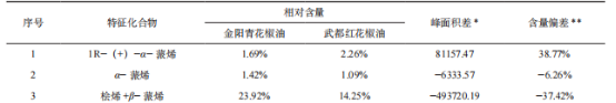 花椒作物在我國(guó)很多地區(qū)都有種植,花椒的揮發(fā)油是花椒香氣的主要來(lái)源,也是反映花椒香氣的主要指標(biāo),花椒中揮發(fā)油的含量及組成成分不僅受到花椒品種、產(chǎn)地環(huán)境因子(如產(chǎn)地氣候、雨量、日照時(shí)間、土質(zhì)等)的影響,還受到提取加工方法、提取部位和采收時(shí)期等外在因素的影響。 超快速氣相電子鼻技術(shù)具有分析速度快、靈敏度高和檢測(cè)費(fèi)用低等優(yōu)點(diǎn)。超快速氣相電子鼻將雙快速氣相色譜檢測(cè)與基于多變量統(tǒng)計(jì)的強(qiáng)大數(shù)據(jù)處理和感官及化學(xué)表征(Arochembase)的可選模塊相結(jié)合,利用超快速氣相電子鼻技術(shù),解析不同品種花椒及花椒提取物揮發(fā)性化合物,通過(guò)主成分分析建立產(chǎn)品有效判別模型,同時(shí)解析花椒物質(zhì)構(gòu)成。 不同產(chǎn)地花椒原料、花椒精油產(chǎn)品、花椒油產(chǎn)品、nC6-nC16標(biāo)準(zhǔn)溶液。 超快速氣相電子鼻;零空氣發(fā)生器;氫氣發(fā)生器;20mL頂空進(jìn)樣瓶,電子天平。 花椒:取0.2g花椒顆粒于20mL頂空進(jìn)樣瓶中,迅速加蓋密封檢測(cè),設(shè)置3個(gè)平行樣品,降低檢測(cè)誤差。 花椒精油:將花椒精油搖晃均勻后,取20uL于20mL頂空進(jìn)樣瓶中,加蓋密封檢測(cè),每個(gè)樣品設(shè)置3個(gè)平行樣。 花椒油:將花椒油搖晃均勻后,使用電子天平稱(chēng)取0.1g于20mL頂空進(jìn)樣瓶中,加蓋密封檢測(cè),設(shè)置3個(gè)平行樣品。 花椒原料:樣品量0.2g,進(jìn)樣體積500uL,孵化溫度80℃,孵化時(shí)間20min,50℃恒溫30s,1℃/s速率升溫至80℃恒溫30s,3℃/s速率升溫至125℃恒溫10s,3℃/s速率升溫至250℃恒溫11s。 花椒精油:取樣量100μL,捕集溫度40℃,孵化溫度60℃,孵化時(shí)間10min,載氣流量30mL/min;進(jìn)樣量1000uL,進(jìn)樣口溫度200℃,閥溫度為250℃;FID溫度260℃,升溫程序:初始溫度45℃,保持35s,1.0℃/s升至70℃,保持30s,0.5℃/s升至140℃,3.0℃/s升至250℃,保持21s,采集時(shí)間共計(jì)288s。花椒油:取樣量0.1g,捕集溫度40℃,孵化溫度60℃,孵化時(shí)間20min,載氣流量30mL/min;進(jìn)樣量500uL,進(jìn)樣口溫度200℃,閥溫度為260℃,F(xiàn)ID溫度為260℃,升溫程序:初始溫度50℃,保持30s,1.0℃/s升至85℃,保持30s,1.0℃/s升至125℃,保持10s,3.0℃/s升至250℃,保持10s,采集時(shí)間共計(jì)197s。 將裝有樣品的頂空小瓶按照順序依次放入樣品盤(pán),每3個(gè)平行樣品后面放入一個(gè)空瓶,目的是為了消除樣品帶來(lái)的信號(hào)干擾,選擇程序進(jìn)行樣品分析。 使用Heracles超快速氣相電子鼻自帶軟件Alphasoft進(jìn)行樣品數(shù)據(jù)處理,明確揮發(fā)性風(fēng)味物質(zhì)種類(lèi)與含量。 利用正構(gòu)烷烴標(biāo)準(zhǔn)溶液(nC6-nC16)進(jìn)行校準(zhǔn),進(jìn)行保留時(shí)間與保留參數(shù)之間的轉(zhuǎn)換,利用超快速氣相電子鼻自帶數(shù)據(jù)庫(kù)AroChembase數(shù)據(jù)庫(kù)對(duì)樣品中的成分進(jìn)行定性分析,采用峰面積歸一法對(duì)目標(biāo)化合物進(jìn)行定量分析,確定各香氣成分相對(duì)含量。 采用正構(gòu)烷烴標(biāo)準(zhǔn)溶液(nC6-nC16)對(duì)檢測(cè)方法進(jìn)行校準(zhǔn),結(jié)合超快速氣相電子鼻自帶AroChembase數(shù)據(jù)庫(kù)對(duì)樣品中主要揮發(fā)性成分進(jìn)行定性分析,推測(cè)得到匹配度高的化合物。 通過(guò)對(duì)比色譜圖(圖1)發(fā)現(xiàn),樣品間的出峰時(shí)間及出峰位置基本一致,峰面積間存在差異,說(shuō)明樣品中揮發(fā)性成分的種類(lèi)基本一致,含量上存在略微差異。 圖1 武都紅花椒、金陽(yáng)青花椒原料指紋圖譜 青花椒原料中共分析出11種含量較高成分,紅花椒原料中共分析出13種含量較高成分,乙酸芳樟酯與乙酸香葉酯在青花椒中未曾檢測(cè)出。通過(guò)計(jì)算,可知青、紅花椒不僅成分種類(lèi)上有差異,各成分含量上同樣差異明顯。除1R-(+)-α-蒎烯、1,8桉葉素、乙酸芳樟酯、乙酸香葉酯外,其他成分均是青花椒中含量較紅花椒高。其中,青紅花椒原料中芳樟醇含量差別最大,差異最為明顯,D-檸檬烯含量差別較大,但相對(duì)偏差不大,推斷不是造成青紅花椒風(fēng)味不同的主要差異。乙酸芳樟酯、乙酸香葉酯僅存在于紅花椒原料中,由此可利用花椒原料產(chǎn)品中芳樟醇、乙酸芳樟酯、乙酸香葉酯含量區(qū)分花椒原料種類(lèi)。 表1 武都紅花椒、金陽(yáng)青花椒原料特征化合物相對(duì)含量與峰面積差異 青花椒精油中共分析出11種含量較高成分,紅花椒精油中共分析出13種含量較高成分,乙酸芳樟酯與乙酸香葉酯在青花椒中未曾檢測(cè)出,與原料表現(xiàn)一致。通過(guò)計(jì)算峰面積差值和含量偏差可知,乙酸芳樟酯等酯類(lèi)物質(zhì)僅存在于紅花椒中。1R-(+)-α-蒎烯、月桂烯、D-檸檬烯、1,8桉葉素在紅花椒精油中含量較高,其他組分在青花椒精油中含量較高,和原料情況不一致,可能和提取工藝有關(guān)。其中芳樟醇含量差別最大,差異最為明顯,乙酸芳樟酯、乙酸香葉酯僅存在于紅花椒精油產(chǎn)品中,由此可利用花椒精油產(chǎn)品中檜烯、β-蒎烯、芳樟醇含量和乙酸芳樟酯、乙酸香葉酯等酯類(lèi)物質(zhì)存在與否來(lái)區(qū)分花椒精油種類(lèi)。 圖2 武都紅花椒精油、金陽(yáng)青花椒精油指紋圖譜 表2 武都紅花椒精油、金陽(