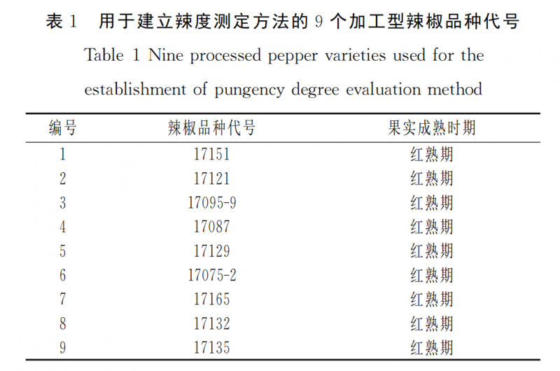 辣椒,其果實既可以作為鮮食蔬菜,供人們直接食用,也可制成不同風味的辣椒醬作為佐餐的調味佳品,此外,其還是 生 物 堿、天然色素和制藥的重要工業原料。我國辣椒栽培面積占世界辣椒的35%,總栽培面積已超過1000 萬公頃。我國辣椒經濟產值和效益居各類蔬菜之首,栽植遍布全國各地,形成的品種類型間差異巨大,滿足了不同需求。對辣椒產品加工而言,原材料的質量穩定和標準化是必要的前提,其中穩定辣度篩選是評價辣椒品質的重要指標。企業在收購和使用前,必須對辣椒果實的辣度進行檢測,以確保各批產品的辣味穩定。因原料數量巨大、儲運加工過程等環節的技術要求,需要建立快速準確的辣度檢測方法。