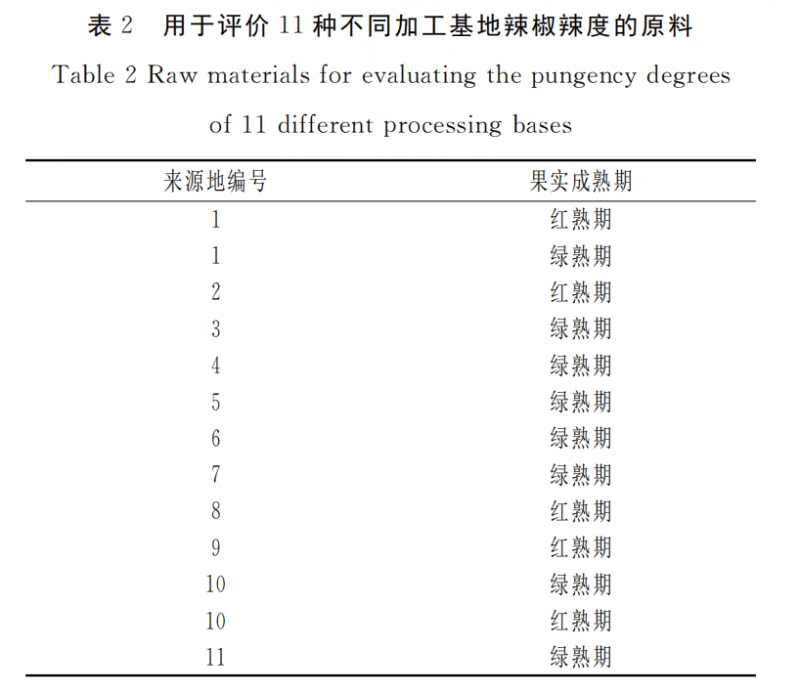 采用9種已知辣度的辣椒紅果果實,建立應用電子鼻評價加工型辣椒果實辣度的方法,見表1;應用所建立的辣度評價方法分別檢測11種辣椒紅果及辣椒綠果,檢測的11個辣椒加工基地的原料見表2。將試驗材料于常溫、避光保存,待測定。
