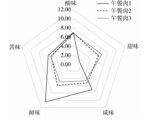 由圖5可知,午餐肉2的情緒反應(yīng)最高,午餐肉1的情緒反應(yīng)最低;從積極情緒上分析,午餐肉2使人感到“愉快”和“驚奇”,午餐肉1次之,午餐肉3最低。從消極情緒上判斷,午餐肉3令人感到“悲傷”和“厭惡”,午餐肉1令人感到“憤怒”和“懼怕”,說(shuō)明午餐肉3的口感更不盡如人意,而午餐肉1的口感與實(shí)驗(yàn)者期待的滋味差別較大。因此,味覺(jué)實(shí)驗(yàn)表明,午餐肉2的口感可接受度最高,這與感官評(píng)價(jià)的結(jié)論一致。電子舌分析結(jié)果