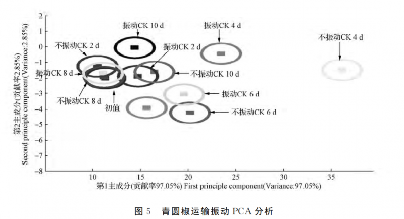 如圖5所 示,為運輸振動 CK 和不振動 CK青圓椒的 PCA 分析圖(A 組),2組的尖椒主成分1的貢獻率 為 97.05%,主成分 2 的貢獻率為2.85%,總貢獻率 為99.90%。表明2個主成分已經基本代表了樣品的主要信息特征,電子鼻能夠對樣品和貯藏時間加以區分。從 圖5可以看出,青圓椒的振動 CK 和不振動 CK10d內的揮發性物質成分區域較為接近,且不同貯藏時間內揮發性物質成分區域有重疊,說明振動組和不振動組貯藏10d內的青圓椒果實揮發性物質變化不大,在貯藏期內,運輸振動和不振動對青圓椒的氣味影響不大,均可保持青圓椒的香氣。