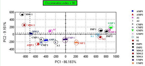 從圖2.2中可以看出,8種不同的鮮味劑能夠被很好的區(qū)分。PC1和PC2兩個主成分的貢獻(xiàn)率分別為86.18%、9.15%,累計方差貢獻(xiàn)率為95.33%。說明PC1和PC2包含了較大的樣品信息量,能很好的反應(yīng)樣品的信息,反應(yīng)了不同鮮味劑的差異。3次重復(fù)數(shù)據(jù)點可以清晰的聚成一個獨立的族群,說明PCA分析得到的實驗數(shù)據(jù)的重復(fù)性很好。所有樣品組內(nèi)離散度小,組間距離較大,DI為98,區(qū)分度較高。每種鮮味劑的兩個濃度在PC2上按低濃度在上,高濃度在下的順序排列。