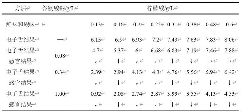 按表稱取一定量的酸與不同濃度的鮮味物質(zhì)相互混合配成100mL的溶液,待用。通過電子舌和感官評價兩種方法對鮮味和酸味的二元相互作用結(jié)果進(jìn)行分析,結(jié)果見表2.4。