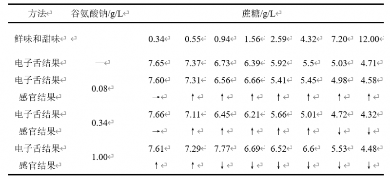 按表稱取一定量的甜味物質(zhì)與不同濃度的鮮味物質(zhì)相互混合配成100mL的溶液,待用。通過電子舌和感官評價兩種方法對鮮味和甜味的二元相互作用結(jié)果進(jìn)行分析,結(jié)果見表2.5。