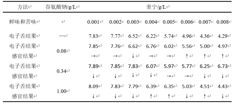 按表稱取一定量的苦味物質(zhì)與不同濃度的鮮味物質(zhì)相互混合配成100mL的溶液,待用。通過電子舌和感官評價兩種方法對鮮味和苦味的二元相互作用結(jié)果進(jìn)行分析,結(jié)果見表2.6。