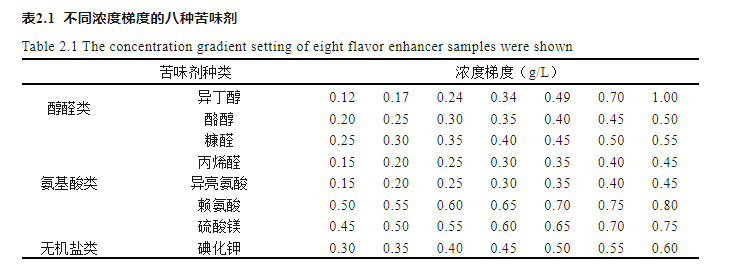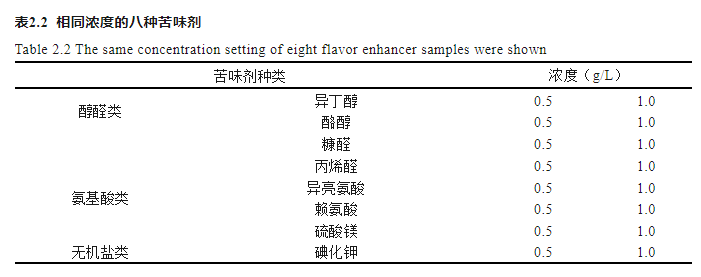 單一苦味物質濃度:按表2.1和2.2所列的濃度,準確稱取不同量的8種苦味物質,于蒸餾水中攪拌溶解,待全部溶解后,轉移至100 mL的容量瓶中,定容,配制成表中所示的濃度,備用。