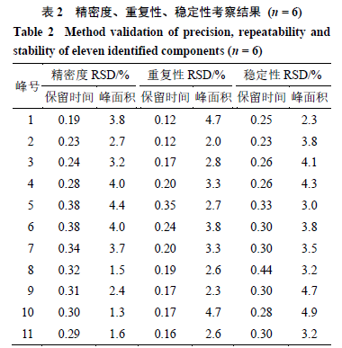2.5.2 重復性試驗 按“2.3”項下方法平行制備6批供試品粉末,裝于6個進樣瓶中,每份稱取1.0 g,精密稱定,進樣分析。結果(表2)表明,11個色譜峰的保留時間和峰面積的RSD最大值分別為0.35%、4.7%,表明方法重復性較好。