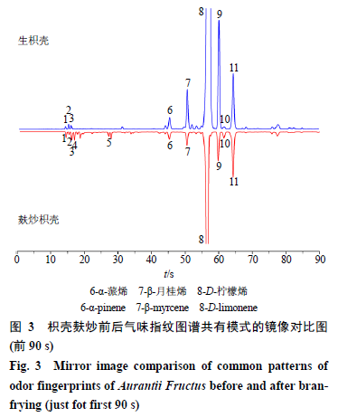 將生枳殼飲片和麩炒枳殼飲片氣味指紋圖譜共有模式(由于色譜峰主要集中在前90 s內,故選擇前90 s的色譜圖)作鏡像圖,比較兩者色譜峰的數目及峰面積變化規律,尋找專屬性差異,可直觀觀察炮制前后的氣味量比關系變化情況,結果見圖3。由圖譜可知,在前10~30 s內,麩炒枳殼相比于生枳殼,色譜峰數目有增加,例如4、6號峰;在50~70 s內,麩炒枳殼相比于生枳殼,色譜峰數目幾乎無變化,但色譜峰的峰高下降明顯,例如8~10號峰;經計算發現,12批麩炒枳殼飲片中8號峰(β-月桂烯)峰高平均下降54.5%、9號峰(D-檸檬烯)平均下降42.4%,10號峰(γ-松油烯)平均下降46.1%,表明枳殼經麩炒后揮發性成分含量下降明顯。與文獻“經麩炒后,麥麩皮可以吸收部分揮發油,使揮發油成分降低”論述相一致[15]。