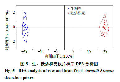 2.6.3 判別因子分析(discriminant factor analysis,DFA) DFA是在主成分分析的基礎上,根據某些準則建立判別函數,將不同組別樣本的差異擴大,使同類樣本間差異縮小的一種具有判別分類功能的數據模型,可以用來識別和分類未知樣本[11,17]。對生、麩炒枳殼樣品的超快速氣相電子鼻數據進行判別因子分析,結果如圖5所示,橫、縱坐標分別表示DFA轉換得到的第1區分指數(DF1)和第2區分指數(DF2)。圖中DF1的區分指數為100%,說明DFA分析法能夠更好地從氣味角度區分生、麩炒枳殼樣品,且二者距離較遠,氣味明顯改變,差異較大,這也符合實際感官描述。表明氣相電子鼻可以快速鑒別生、麩炒枳殼飲片,進一步驗證了PCA的分析結果。