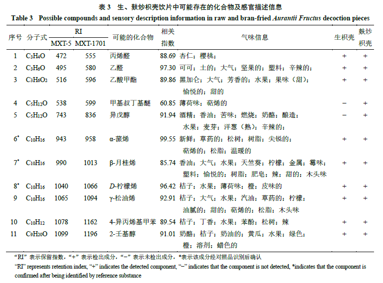 2.6.4 生、麩炒枳殼飲片氣味差異標志物分析 將生、麩炒枳殼飲片在超快速氣相電子鼻色譜柱上采集到的色譜峰與Arochembase數據庫進行匹配分析,結果共鑒定出11個主要氣味化學成分,其中生枳殼飲片中有9個氣味化學成分,與麩炒枳殼相比,缺少甲基叔丁基醚、異戊醇2個成分。生、麩炒枳殼中可能存在的化合物及感官描述信息見表3。進一步分析已鑒定出的可能化合物氣味信息發現,β-月桂烯、D-檸檬烯、γ-松油烯、4-異丙烯基甲苯、2-壬基醇具有“桔子、橙、檸檬”的味道,而桔子、橙、檸檬均為蕓香科柑橘屬植物,果皮均含有豐富的揮發油,β-月桂烯、D-檸檬烯和γ-松油烯為單萜類化合物,是揮發油的組成成分,具有特殊香氣,且D-檸檬烯主要存在于柑橘類植物中[18];本研究用枳殼飲片來源于蕓香科柑橘屬植物,表明已鑒定出的成分與枳殼含有的成分有較好的一致性。