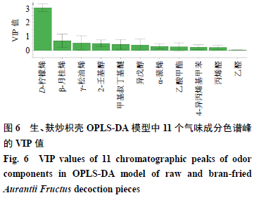 在得到生、麩炒枳殼飲片氣味成分信息的基礎上,為進一步分析得出氣味差異標志物,以11個氣味成分所對應的色譜峰峰面積為變量,采用SIMCA 14.1軟件建立生、麩炒枳殼OPLS-DA模型,分析得到11個成分的VIP值,結果見圖6。VIP值越大,表明該成分對區分生、麩炒枳殼飲片的貢獻越大。由圖6可知,對區分生、麩炒枳殼飲片貢獻較大的前3個成分是D-檸檬烯、β-月桂烯和γ-松油烯,且這3個成分也是多數學者研究[19-20]有報道的枳殼揮發油組成成分,結合枳殼麩炒前后揮發性成分含量變化情況,初步推測這3個成分為區分生、麩炒枳殼飲片的氣味差異標志物。