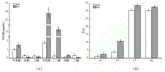 圖2 百香果果汁及果酒中的有機(jī)酸含量(A)和色澤變化(B)