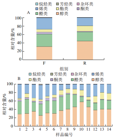 依據專家感官審評結果(表1)將14個茶樣分成兩類:優質紅茶組,用R表示(7個);缺陷紅茶組,用F表示(7個)。優質紅茶組香氣特征主要呈現甜香、甜花香等,從香氣評分來看,優質紅茶香氣評分均高于90分。缺陷紅茶組香氣主要表現為熟悶、不純、駁雜、青草氣強、火工偏高等,其評語中以“偏、透、欠”等傾向性強的副詞修飾較多,從香氣評分來看缺陷紅茶評分則低于85分,。綜上分析可知,兩類紅茶香氣品質存在明顯差異性。