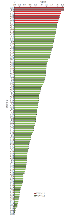 紅茶揮發性組分表征為實現對工夫紅茶香氣品質全面而綜合的分析,將上述提及的44維GC-E-Nose數據集與73維GC-MS數據集融合為一個117維數據集,并采用UV歸一化處理,以構建基于電子鼻-GC-MS融合技術的工夫紅茶香氣品質分類模型。融合數據OPLS-DA結果如圖3所示,優質紅茶組位于第1、4象限中,缺陷紅茶組位于第2、3象限中(圖3A),兩類茶樣分類明顯,組內聚攏趨勢更強,其模型參數(R2Y=0.976,Q2=0.959)較單一GC-E-Nose或GC-MS技術的OPLS-DA模型有一定提升,模型擬合和預測能力更強。為了驗證該模型的準確性,對數據進行200次置換檢驗,結果顯示R2=0.434,Q2=-0.640(圖3B),說明該模型可靠,不存在過擬合現象。此外,依據變量投影重要性(VIP)>1和P<0.05的原則初步篩選缺陷紅茶與優質紅茶的關鍵差異性組分,共篩選出47個變量,其中34個變量來源于GC-MS,13個變量來源于GC-E-Nose(圖3C)。進一步地,基于VIP>1.6的原則,篩選出8個區分優質紅茶與缺陷紅茶的重要差異化合物(9個數據變量對應8個物質),包括二甲基硫醚(B3、B25)、β-紫羅酮(A59)、(3E)-4,8-二甲基壬-1,3,7-三烯(A20)、二氫獼猴桃內酯(A64)、芳樟醇(A17)、苯乙醇(A19)、δ-辛內酯(A41)和γ-壬內酯(A45)。其中二甲基硫醚、(3E)-4,8-二甲基壬-1,3,7-三烯、芳樟醇3個物質在載荷圖(圖3D)中更靠近優質紅茶組,其含量在優質紅茶組中更高,而β-紫羅酮、二氫獼猴桃內酯、苯乙醇、δ-辛內酯和γ-壬內酯5個物質則更靠近缺陷紅茶組,其相對含量在缺陷紅茶組中更高。