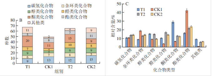 為探究嫩葉和熟葉杜仲茶汽爆前后制成杜仲茶的香氣特征差異,利用HS-SPME-GC-MS聯用對4 種處理杜仲茶的揮發性化合物成分和相對含量進行分析鑒定,得到其總離子流圖(圖4),共檢測到177 種揮發性物質,其中,CK1、T1、CK2和T2中可鑒定的峰面積分別占比92.32%、100.00%、94.50%和100.00%。根據化合物類型將其分為碳氫化合物、雜環類化合物、醇類化合物、醛類化合物、酮類化合物、酯類化合物和其他類化合物。由圖5A可知,CK1、T1、CK2和T2 4 個處理所制的杜仲茶揮發性化合物種數差異顯著,數量排序為T1>CK2>T2>CK1,汽爆處理后的成熟葉茶揮發性化合物種類高于未汽爆處理,增加了16 種,而嫩葉茶汽爆前后揮發性化合物種類無顯著差異。其中,嫩葉茶汽爆后醛類、酮類和雜環類分別增加了2、6 種和3 種,成熟葉茶汽爆后醇類、醛類和酮類分別增加了5、3 種和9 種(圖5B)。CK1、T1、CK2和T2 4 種杜仲茶揮發性化合物相對含量的差異也十分顯著,酯類是相對含量最高的化合物類型,相對含量分別為42.07%、16.33%、23.70%和21.89%;酮類相對含量分別為6.63%、29.05%、12.30%和13.15%;碳氫類的相對含量分別為10.76%、10.83%、14.20%和13.89%;醇類的相對含量分別為9.27%、15.22%、9.48%和14.87%;雜環類的相對含量分別為18.73%、8.83%、14.13%和13.13%;其他類的相對含量分別為0.90%、8.68%、5.25%和4.92%(圖5C)。