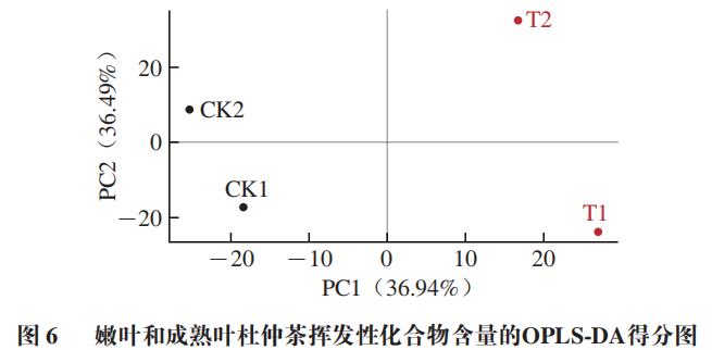 如圖6所示,模型累積解釋率R2x為0.999 1,整體預測能力Q2為-0.704 0,置換檢驗200 次的模型R2=0.999 1,Q2=-0.862 5,并且Q2回歸曲線與Y軸的截距小于0,表明模型不存在過度擬合現象,結果較為可靠。在OPLS-DA中,茶樣之間距離越小則差異越小,反之則意味著差異較大。CK2、T2、CK1和T1分別置于4 個象限,表明杜仲嫩葉茶和成熟葉茶揮發性化合物組成在蒸汽爆破處理后均發生了顯著變化,同時,嫩葉茶和成熟葉茶之間的揮發性化合物組成存在顯著差異。整體上,4 種處理的揮發性化合物組成均能被有效區分開。