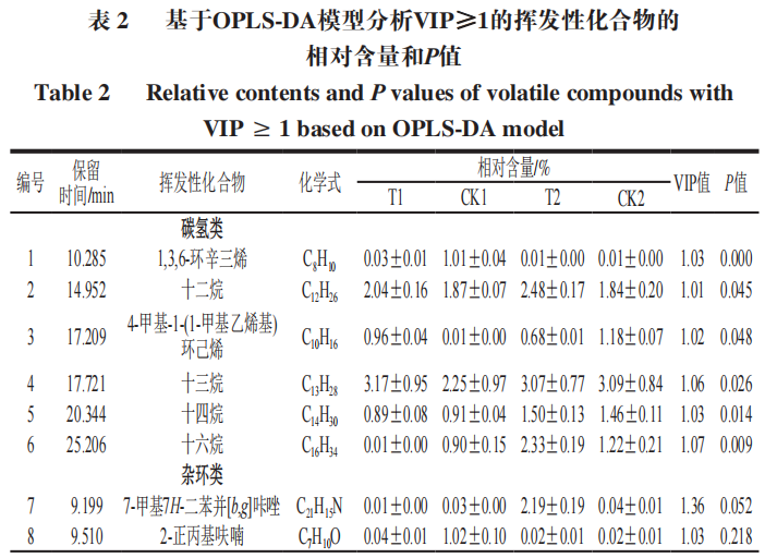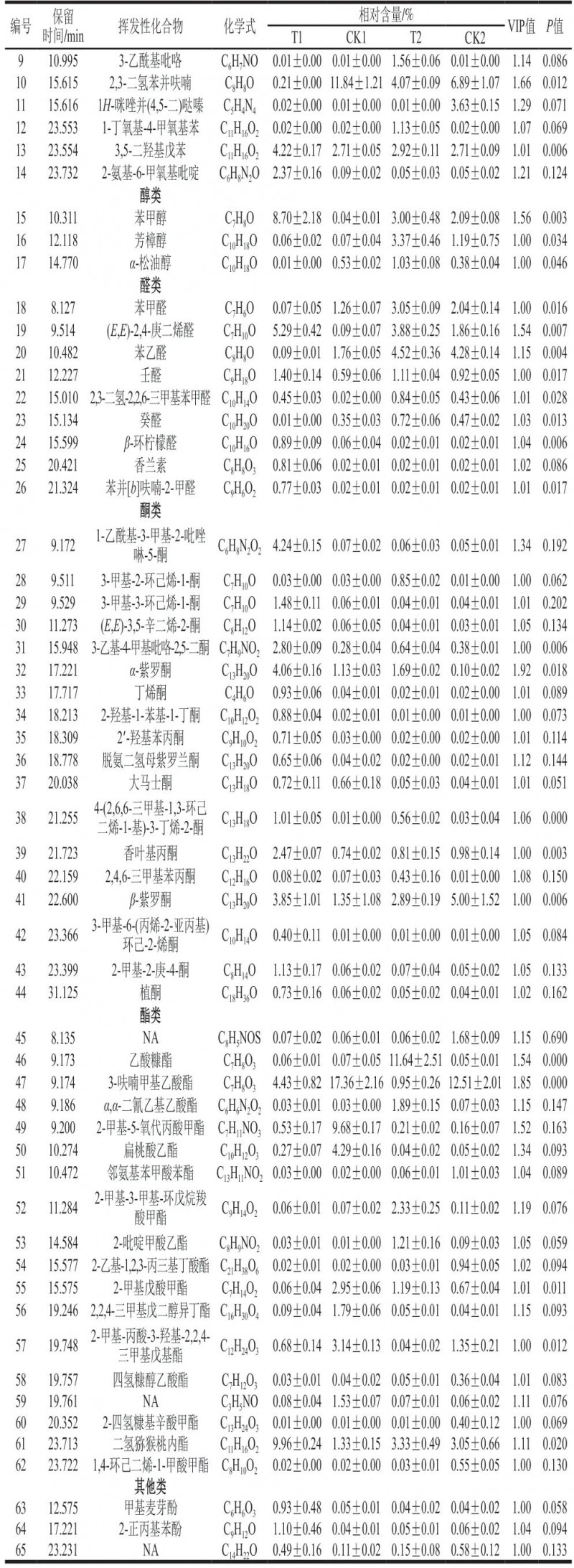 如表2所示,VIP≥1的揮發性化合物共有65 種。其中,酯類物質主要為二氫獼猴桃內酯、3-呋喃甲基乙酸酯和2-甲基戊酸甲酯,酮類物質主要為大馬士酮、香葉基丙酮、β-紫羅酮、3-乙基-4-甲基吡咯-2,5-二酮和4-(2,6,6-三甲基-1,3-環己二烯-1-基)-3-丁烯-2-酮,碳氫類物質主要為十二烷、十三烷、十四烷、十六烷和4-甲基-1-(1-甲基乙烯基)環己烯,醇類物質主要為苯甲醇、α-松油醇和芳樟醇。