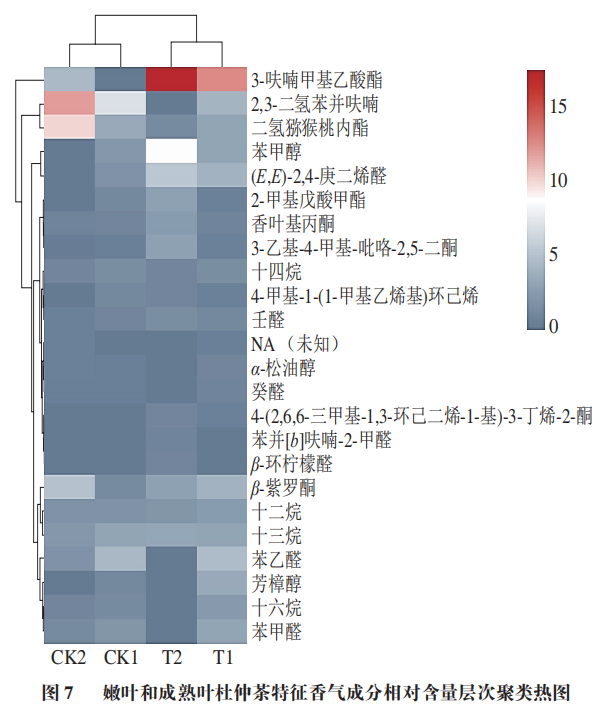 為進一步縮小特征香氣化合物范圍,從VIP≥1的揮發性化合物中,篩選出差異代謝物達到顯著水平(即P<0.05)的揮發性化合物,得到24 種特征香氣化合物,對應的層次聚類熱圖如圖7所示,其中,CK2中相對含量最高的是醛類和雜環類,CK1、T1和T2中相對含量最高的是酯類。T2和T1中相對含量增加最顯著的均是酯類和酮類,分別增加了13.06%和4.12%、9.71%和4.84%。