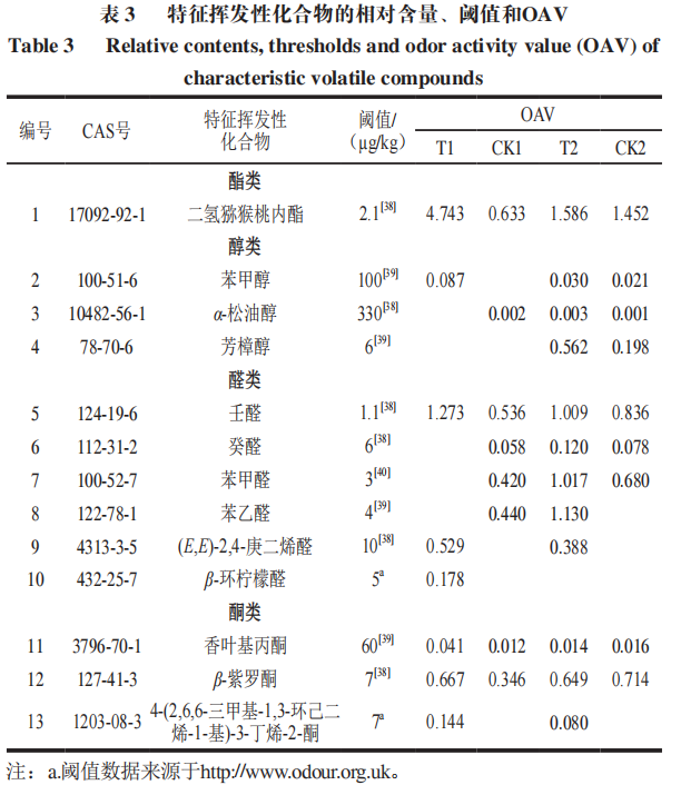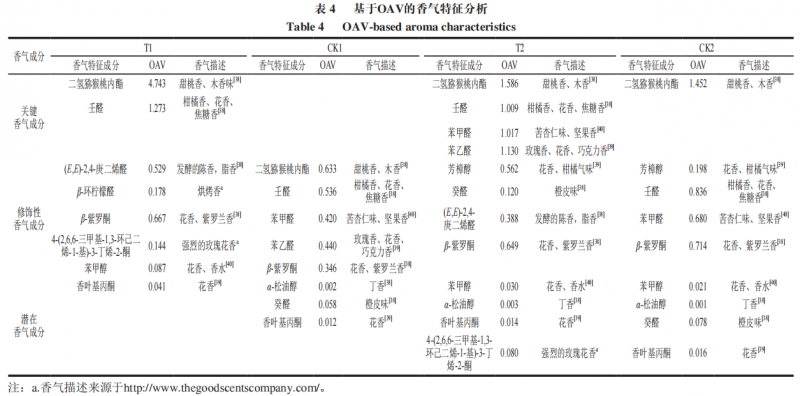 基于OAV的香氣特征分析如表4所示,當OAV>1時,定義為關鍵香氣成分,該香氣成分對總體香氣有直接影響;當0.1<OAV≤1時,定義為修飾性香氣成分,該香氣成分對總體香氣有輔助影響;當0<OAV≤0.1時,定義為潛在香氣成分,該香氣成分對總體香氣有潛在影響。在一定范圍內,OAV越大說明該香氣成分對總體風味貢獻越大。T1的關鍵香氣組分(OAV>1)為二氫獼猴桃內酯和壬醛,呈現甜桃香、木香、柑橘香、花香、焦糖香,CK2為二氫獼猴桃內酯,呈現甜桃香、木香,T2為二氫獼猴桃內酯、壬醛、苯甲醛和苯乙醛,呈現甜桃香、木香、柑橘香、花香、焦糖香、苦杏仁味、堅果香、玫瑰香、巧克力香。二氫獼猴桃內酯在T1、T2和CK2 3 種茶樣香氣中均占主導地位,其OAV以T1最高,為4.743,其次是T2為1.586。